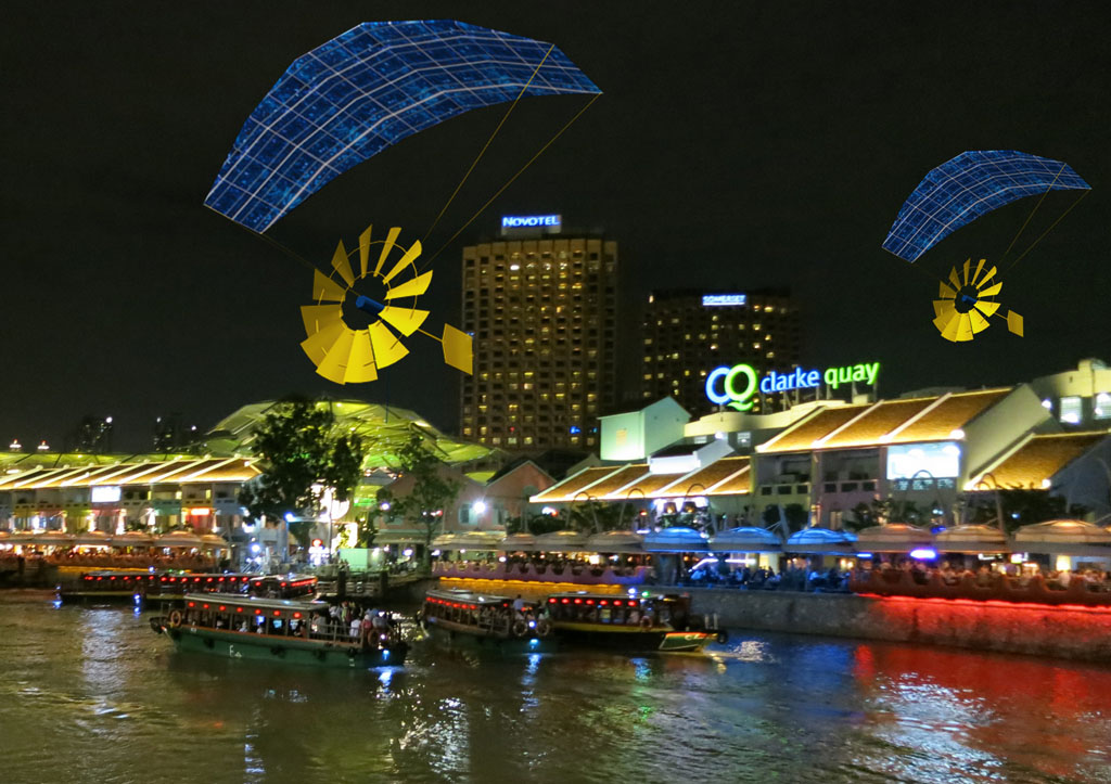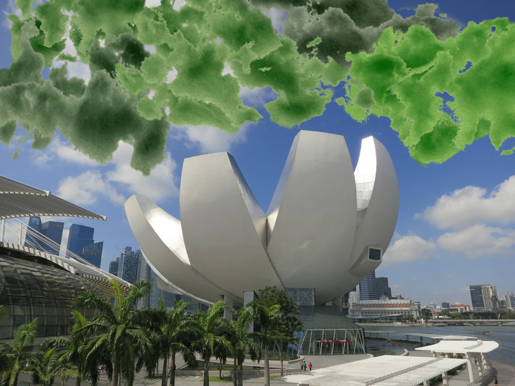 The augmented reality artwork “Clouding Green” floats a massive augmented reality cloud – in colors ranging from sooty carbon black to brilliant renewable green, depending on their clean energy index – over 8 major Silicon Valley cloud computing providers cited in the Greenpeace report “How Clean is Your Cloud.” For DAW Singapore I created a composite of several of the clouds, and floated it above the ARtScience Museum. On an iPad as you look at each cloud a pop-up label tells you which company generated which cloud, and what percent of their energy comes from renewable sources. Go to the Clouding Green main page...