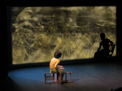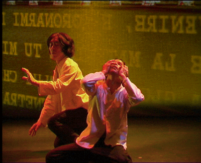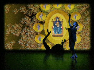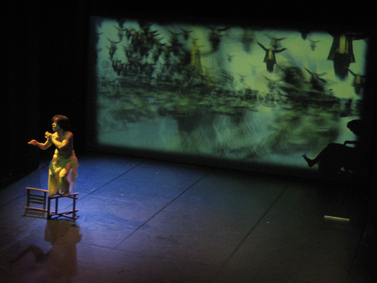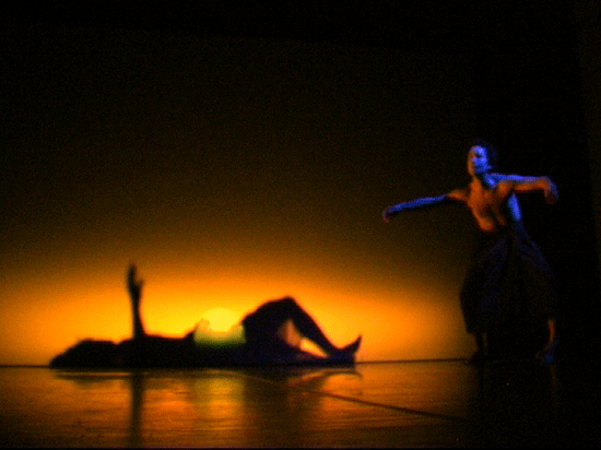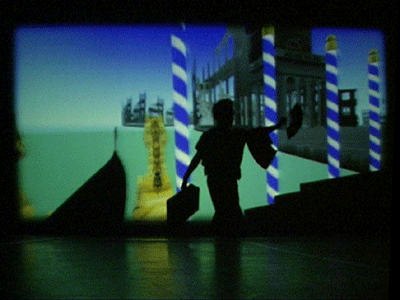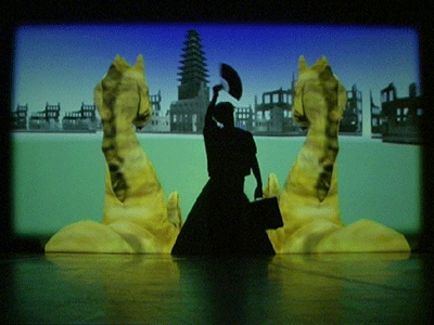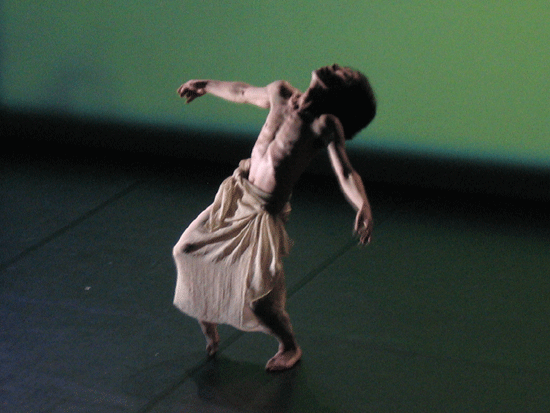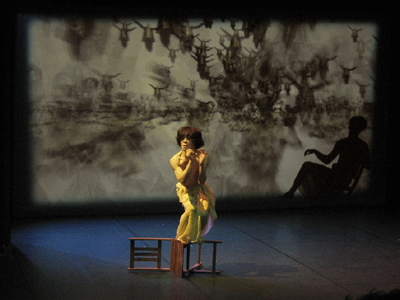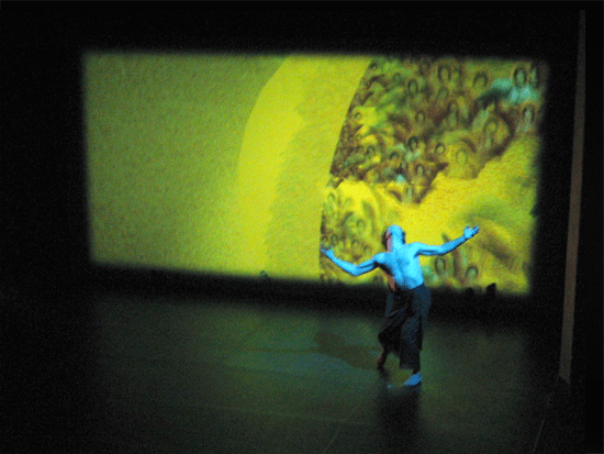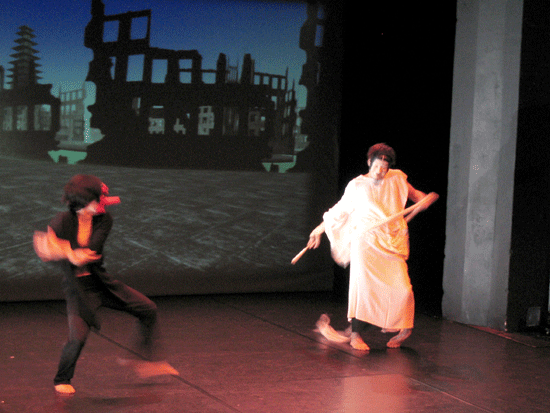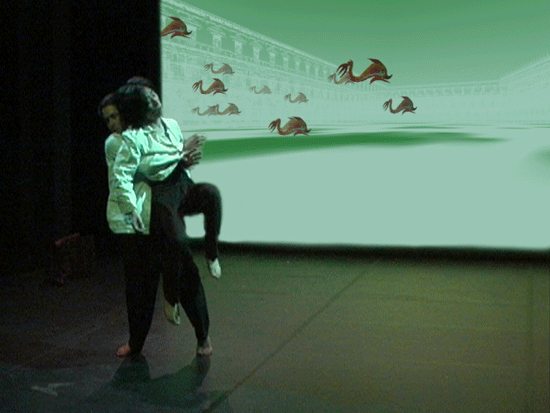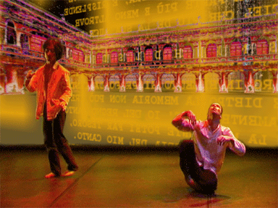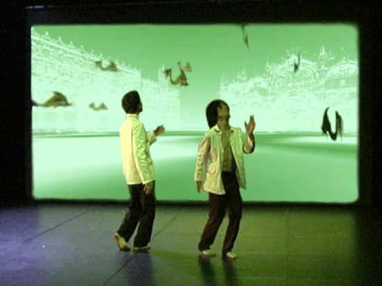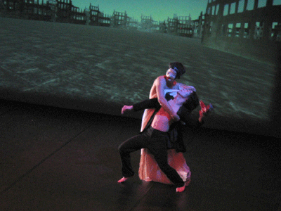 live dance performance with interactive 3D stage set The dance performance In the Land of Babari-an is an inner journey in which the dancers, Shinichi Iova-Koga and Ishide Takuya, incorporate their own East/West experiences with the fantastic stage set of The Travels of Mariko Horo, deriving inspiration both from Japanese mythology (Urashimataro, Musume Dojoji) and from Dante’s Divine Comedy. The two dancers are not however the wise Poet Virgil and naïve Pilgrim Dante, but rather two bumbling tourists who stumble – sometimes in harmony, sometimes in brutal conflict – between Heaven and Hell, between jewelled underwater palaces and the ruins of a post-apocalyptic Venice. The space of the dance performance encompasses the stage in front of the screen, the 3D virtual world on the screen itself and the shadow world behind the screen. In front of the screen, colored stage lights controlled by light artist Rainer Ludwig integrate the dancers into the virtual world. Behind the screen the back-lit dancers – inspired by Dante’s “shades” – move as shadows through the virtual world, playing the full depth of the back stage to deepen the third dimension of the virtual image. Additionally, pre-processed images of the dancers appear in the virtual world, sometimes as angels, sometimes as lost and tortured souls. Thus the performance space traverses and includes the virtual space, integrating the dancers both in front and behind the screen as real and as virtual figures. Here is a review of the performance (in German) from Ursula Hentschlaeger in the online journal artmagazine.cc. The following photos were taken by Peter Graf and Horst Konietzny.