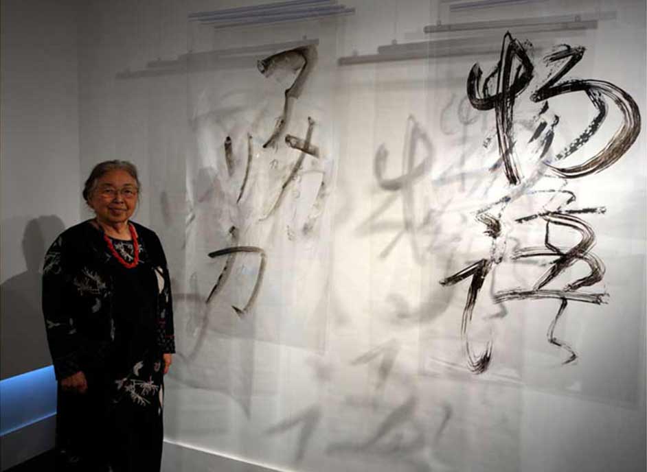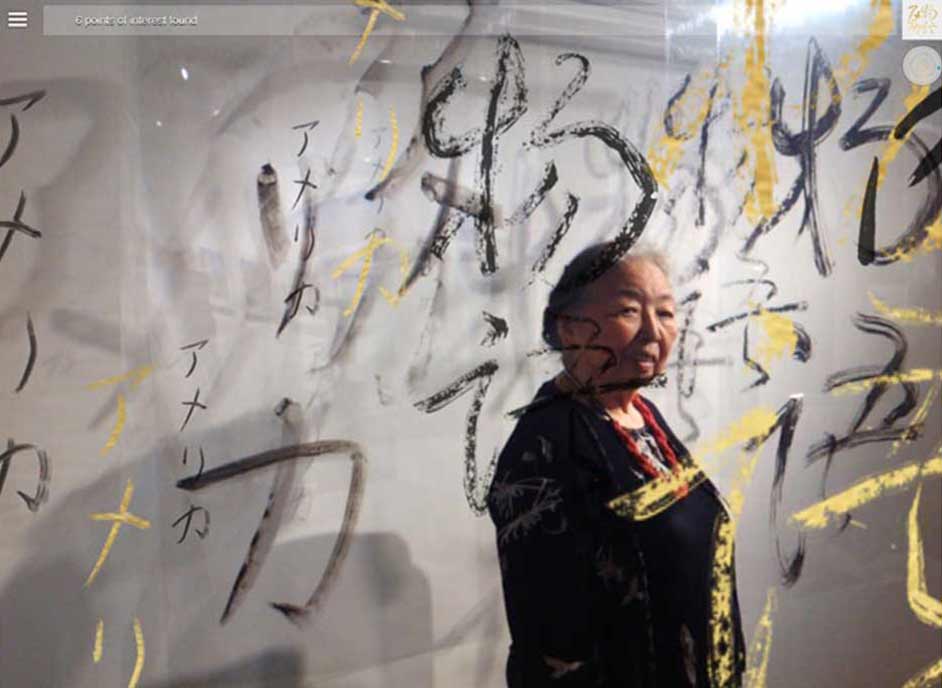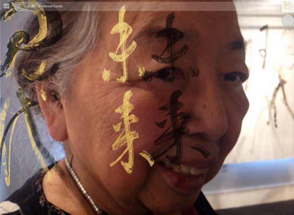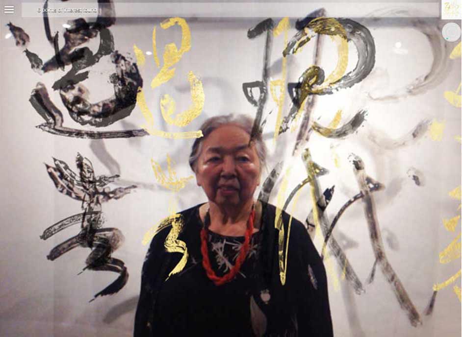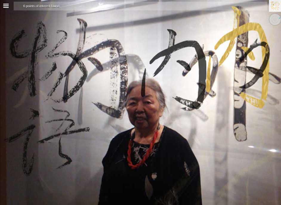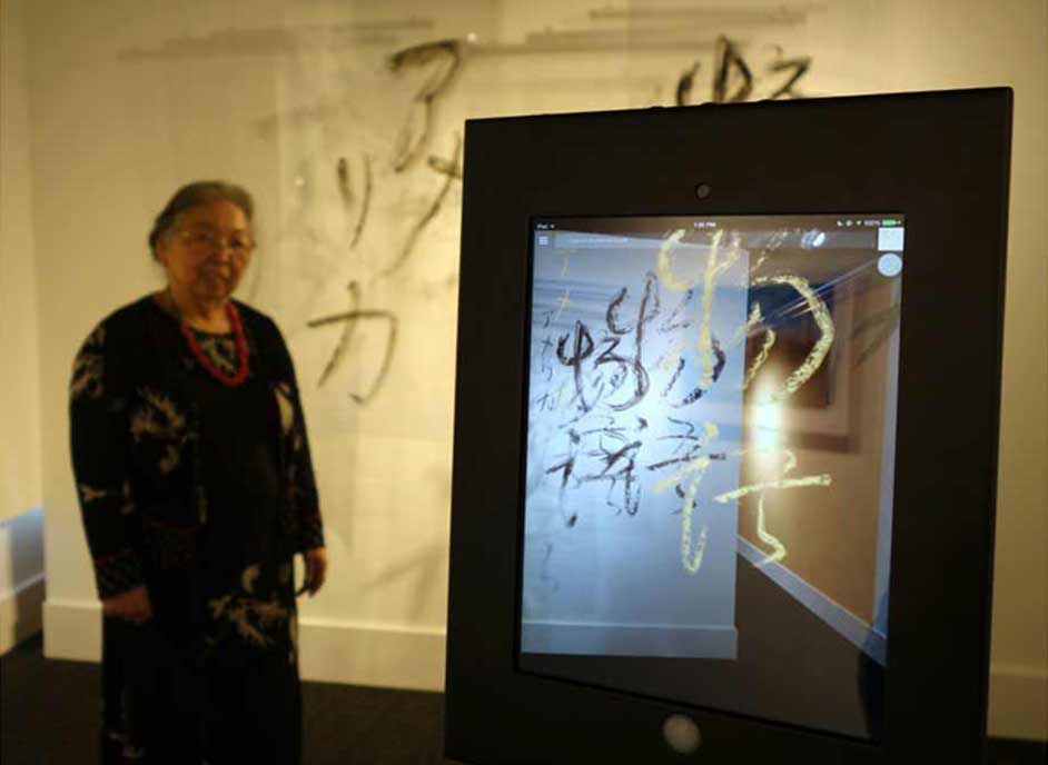 Her daughter Tamiko Thiel enhanced the installation with augmented reality (AR)* overlays. These virtual artworks, visible through an iPad mounted on a rotatable pedestal, enclosed visitors between veils of "real" and "virtual" calligraphy to incorporate them into a total installation.