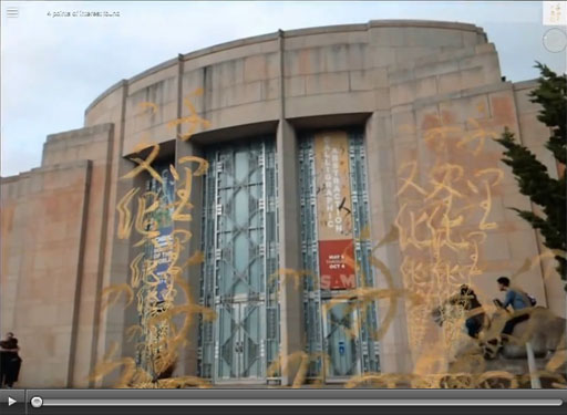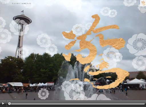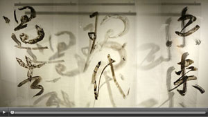 Brush the Sky gallery installation, CONSTRUCT\S exhibit, Wing Luke Museum This video highlights details of Midori Kono Thiel's unique Japanese calligraphy, deconstructed across multiple mylar layers to create abstract transparent wall hangings. The hangings are overlaid with an animated augmented calligraphy layer by Tamiko Thiel. Click image for video on Vimeo.