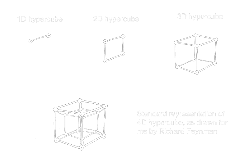 "Go talk to Richard Feynman, it's his idea!" said Danny. Richard, who was awarded a Nobel prize for quantum chromodynamics, was a professor at CalTech, but spent his summers with us for fun. His answer was classic Feynman: "Oh, that's EASY!" he said, and promptly starting drawing diagrams. "Each chip has 16 processors. Join 2 chips with a wire to make a 1D hypercube. Duplicate that structure and connect the ends - you get a 2D hypercube, which we usually call a square. Each chip has two direct connections, and the longest path across the network is two steps. Duplicate that structure and connect the ends - you get a 3D hypercube, which we usually call a cube. Now for the 4D it gets complicated: duplicate the 3D cube and connect the ends - you get a 4D hypercube, a cube inside a cube. Beyond that it gets really difficult to draw." |