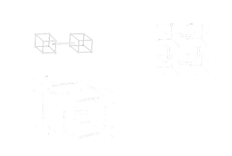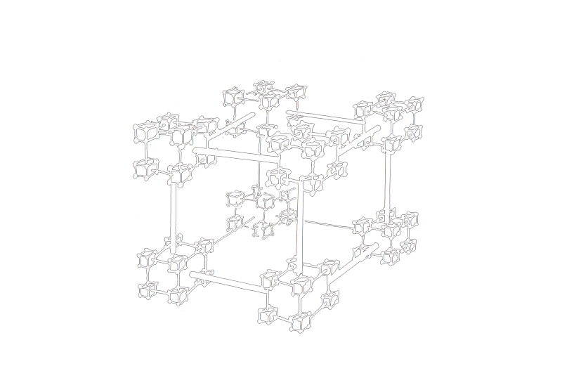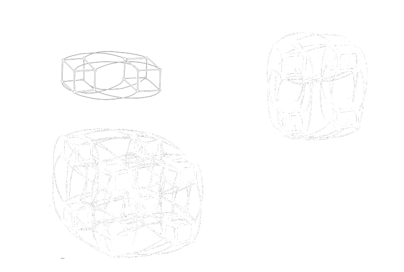 So I went off and played around with the Boolean hypercube concept, trying to figure out how to depict the higher dimensions in a more understandable way. I tried placing the successive cubes side by side, instead within each other, as they were typically drawn. Ahah! Drawn this way, instead of the huge snarl of wires you get when you draw boxes within boxes, a repeating pattern began to appear: the line/square/cube structures repeated themselves every 3 dimensions.