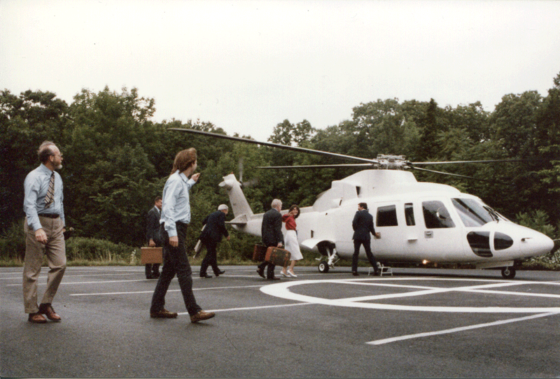 (middle left) and Bill Paley (middle, two briefcases), accompanied by Sheryl Handler to the CBS helicopter