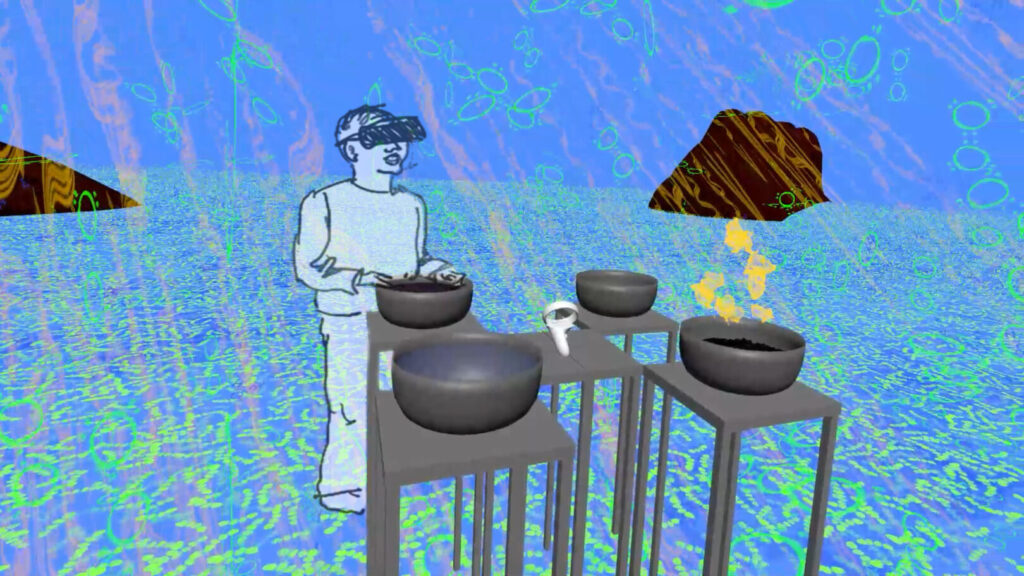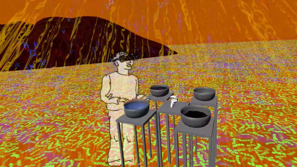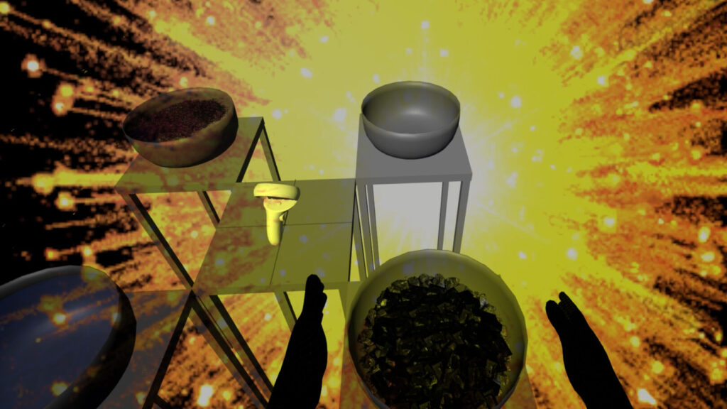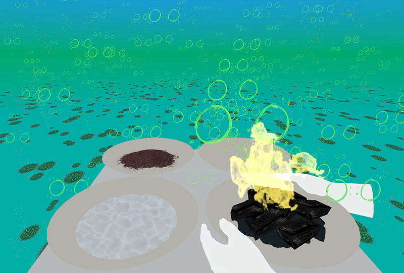 The gallery installation has four bowls, each containing a representation of one of the elements. The bowls and their supporting pedestals exist in both the real and the virtual worlds. Visitors grasp the bowls in both real and virtual worlds.