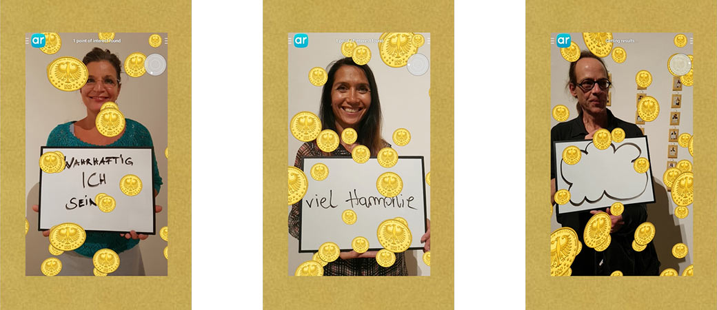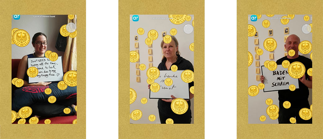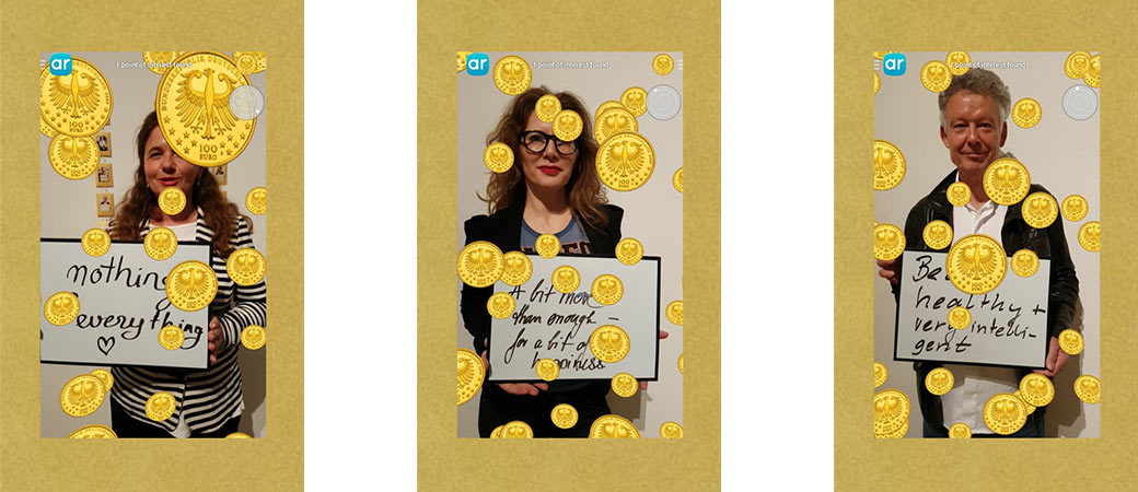 The third edition of "Goldsegen: Golden Blessings" was part of the exhibit Stand by me, in which curator Katia Rid asked artists to respond to Goya's Los Proverbios or Follies. Participants received a copy of their AR photo as a good luck charm in a gold envelope.The second copy became part of the wall hanging in the exhibit.