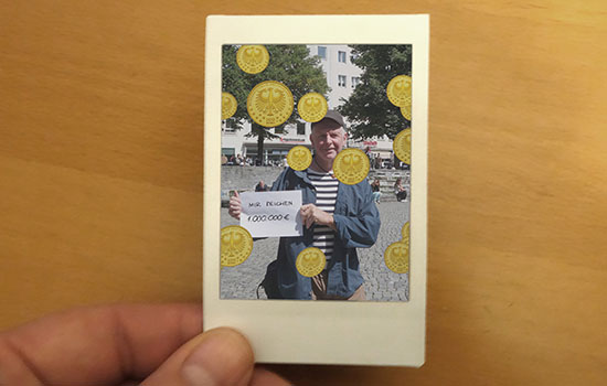 participatory art project - augmented reality and instant printsCommissioned for "Das Rätsel des Überflüssigen" ("Conundrum of the Superfluous"), curator Serafine Lindemann/artcircolo, Munich 2014 New performance and wall hanging for "Stand by me," artists respond to Goya's "Follies" series, curator Katia Rid. Galerie der Künstler, Munich 2017